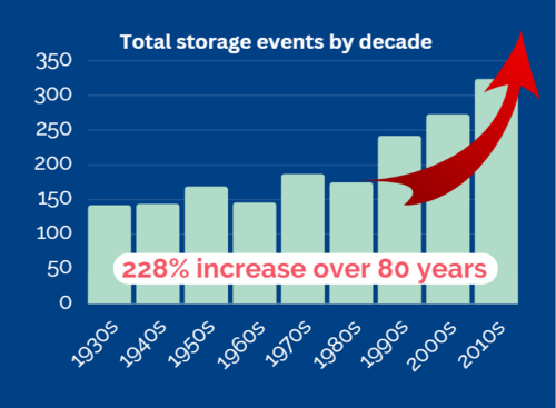 The annual average number of storage events throughout the system's history is 20, but the trend is increasing. The average over the last 30 years has increased to 28. More frequent high-water events mean the dam and levee soils are saturated more often and exposed to more frequent erosive forces.