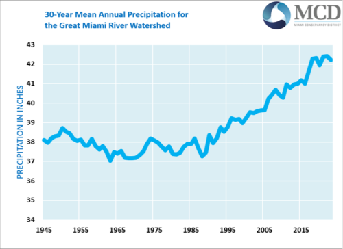 Increasing precipitation trends are adding stress to the system and contributing to more loading on the earthen structures. The change in average precipitation in the Great Miami River Watershed has steadily increased, especially since the 1980s.