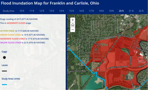 To understand the flood impacted areas at different river stages along the Great Miami River a new Flood Inundation Map was initiated by the Miami Conservancy District and the Ohio Silver Jackets to help people understand the risk of flooding in the Franklin and Carlisle communities. Predictions of river levels and flood warnings can be more meaningful to the public when understood in terms of areas that will be inundated. The Ohio Silver Jackets is an interagency team dedicated to working collaboratively with Federal, State, and local stakeholders. They develop and implement hazard mitigation actions that leverage available agency resources including funding, programs, and technical expertise.