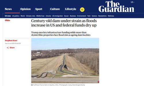 The Guardian published a national news story highlighting the growing risks faced by communities in southwest Ohio due to aging flood protection infrastructure — with a spotlight on Huffman Dam and the Miami Conservancy District (MCD) system.