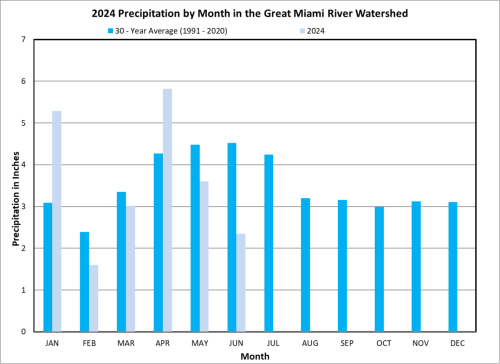 April showers bring May flowers. What did June bring? Not a lot of rain. June brought an average of 2.35 inches of precipitation to the Great Miami River Watershed. That is 2.17 inches below the monthly average. The highest amount of 4.42 inches was recorded at the station near Arcanumand the lowest amount of 1.10 inches was recorded at the station near Centerville. As of June 30, the Great Miami River Watershed has received 21.67 inches of precipitation in 2024 which is 0.43 inches below average for this point in the calendar year.